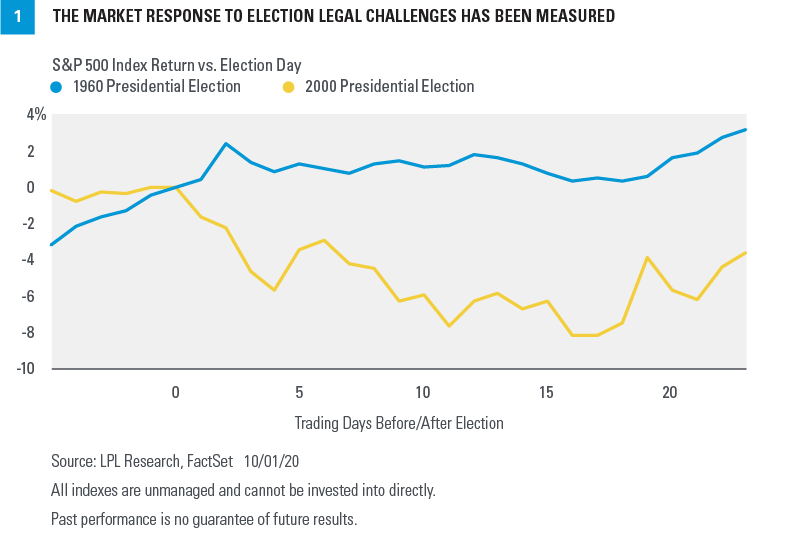 The most comparable historical example is the 2000 election, when a recount in Florida to decide the election led to legal challenges by Democrats. In 2000, the peak decline in the S&P 500 Index from Election Day until former Vice President Al Gore conceded the election was just over 8%, as shown in Figure 1.