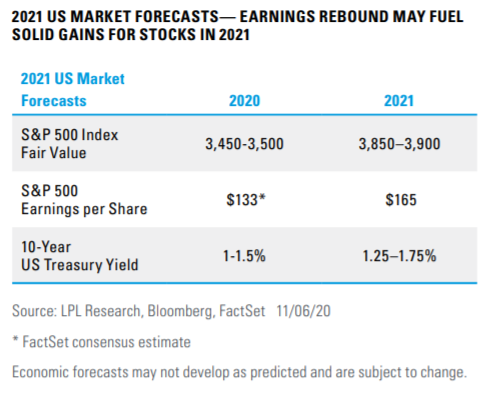 Stocks. A strong earnings rebound in 2021 may allow stocks to grow into somewhat elevated valuations. Cost efficiencies achieved during the pandemic may persist. We see an S&P 500 Index fair value target range of 3,850–3,900 in 2021 with potential for upside with better-than-expected vaccine progress.