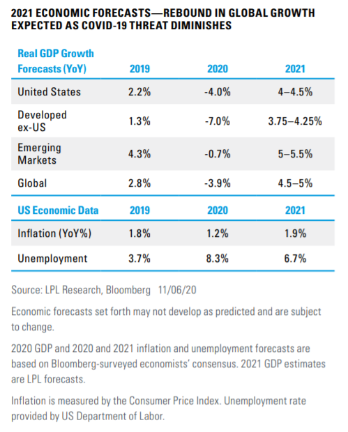 International Economy. Emerging market economies may lead in a global rebound. We believe growth in international developed economies may lag behind the United States, although a strong fiscal response may help Japan. We forecast global GDP growth of 4.5–5%.