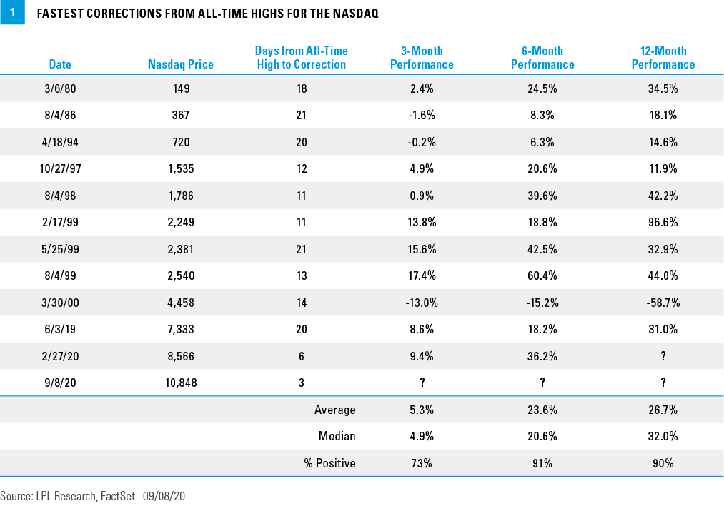 After virtually no volatility since March, market-watchers got a heavy dose of it with the recent three-day 10% correction in the NASDAQ—one of the fastest corrections ever, and the fastest ever from a record high. Historically, the NASDAQ has tended to rise after fast corrections from new highs [FIGURE 1]. Stocks were higher 6 and 12 months after those corrections more than 90% of the time going back 40 years, with the end of the 1990s bull market the glaring exception. Many of these examples took place during the technology boom in the late 1990s, but the history is still instructive.