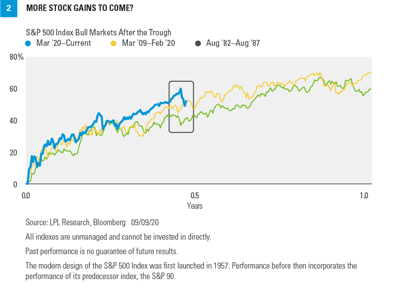 - Momentum breeds momentum. When the S&P 500 has been up five straight months, as it was in April through August, stocks historically have kept going higher. In fact, the last 26 times the index rose for five straight months, it was higher a year later 25 out of 26 times. We also know from history that bull markets tend to run for years, and the one that started March 23, 2020, is very young. That doesn’t mean we won’t have corrections along the way, as we did at similar points in the early 1980s and in 2009, but it tells us more gains may be coming [FIGURE 2].