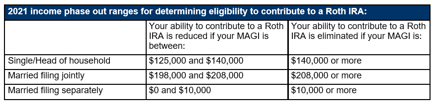 You can contribute to a Roth IRA if your MAGI is within certain limits. For 2021, if you file your federal tax return as single or head of household, you can make a full Roth contribution if your income is $125,000 or less. Your maximum contribution is phased out if your income is between $125,000 and $140,000, and you can’t contribute at all if your income is $140,000 or more. Similarly, if you’re married and file a joint federal tax return, you can make a full Roth contribution if your income is $198,000 or less. Your contribution is phased out if your income is between $198,000 and $208,000, and you can’t contribute at all if your income is $208,000 or more. If you’re married filing separately, your contribution phases out with any income over $0, and you can’t contribute at all if your income is $10,000 or more.